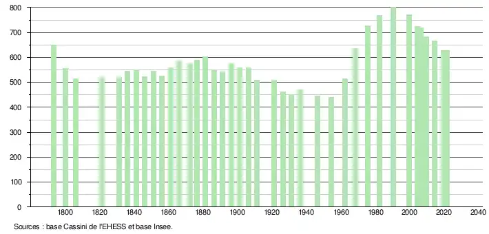 L'évolution du nombre d'habitants est connue à travers les recensements de la population effectués dans la commune depuis 1793. Pour les communes de moins de 10 000 habitants, une enquête de recensement portant sur toute la population est réalisée tous les cinq ans, les populations légales des années intermédiaires étant quant à elles estimées par interpolation ou extrapolation[33]. Pour la commune, le premier recensement exhaustif entrant dans le cadre du nouveau dispositif a été réalisé en 2004[34].
