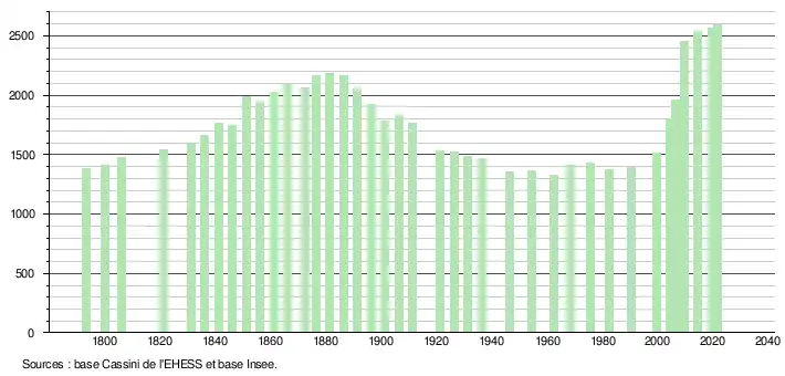 L'évolution du nombre d'habitants est connue à travers les recensements de la population effectués dans la commune depuis 1793. Pour les communes de moins de 10 000 habitants, une enquête de recensement portant sur toute la population est réalisée tous les cinq ans, les populations légales des années intermédiaires étant quant à elles estimées par interpolation ou extrapolation[31]. Pour la commune, le premier recensement exhaustif entrant dans le cadre du nouveau dispositif a été réalisé en 2004[32].