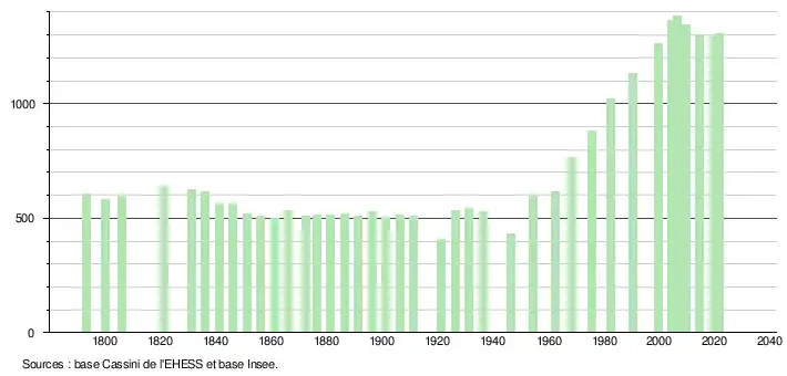 L'évolution du nombre d'habitants est connue à travers les recensements de la population effectués dans la commune depuis 1793. Pour les communes de moins de 10 000 habitants, une enquête de recensement portant sur toute la population est réalisée tous les cinq ans, les populations légales des années intermédiaires étant quant à elles estimées par interpolation ou extrapolation[29]. Pour la commune, le premier recensement exhaustif entrant dans le cadre du nouveau dispositif a été réalisé en 2004[30].