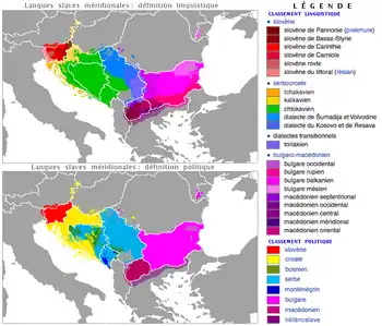 Certains linguistes[81] considèrent comme un dialecte à part le torlakien (torlački) parlé par des Serbes au sud-est de la Serbie, par les Croates « carashovènes » du Banat roumain et par les Bulgares du nord-ouest de la Bulgarie. En effet, les parlers torlakiens et les parlers bulgares de l’Ouest, qui leur sont proches, forment un continuum linguistique, ces parlers étant transitionnels entre les deux langues[82]. C’est pourquoi ils ont fait, jusqu’à une époque relativement récente, l’objet de disputes plus politiques que linguistiques entre linguistes serbes et bulgares, les premiers considérant ces parlers comme des variétés régionales du dialecte chtokavien[83], les seconds affirmant qu’ils sont des variantes régionales du bulgare[84].