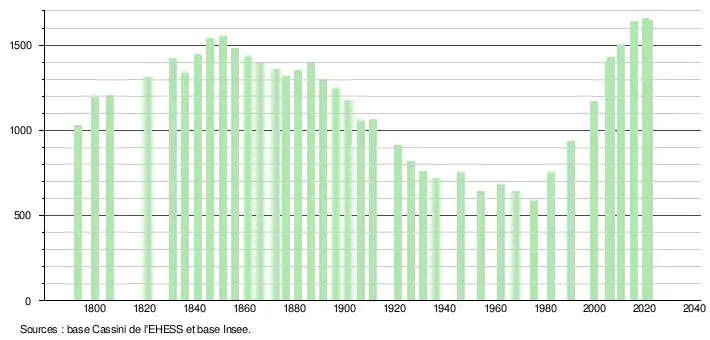 L'évolution du nombre d'habitants est connue à travers les recensements de la population effectués dans la commune depuis 1793. Pour les communes de moins de 10 000 habitants, une enquête de recensement portant sur toute la population est réalisée tous les cinq ans, les populations légales des années intermédiaires étant quant à elles estimées par interpolation ou extrapolation[14]. Pour la commune, le premier recensement exhaustif entrant dans le cadre du nouveau dispositif a été réalisé en 2005[15].
