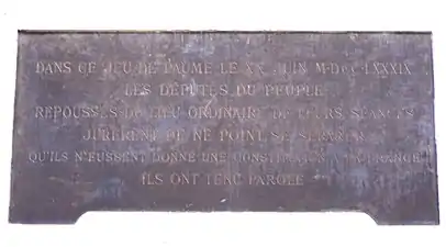 « Dans ce Jeu de paume, le XX juin MDCCLXXXIX, les députés du peuple, repoussés du lieu ordinaire de leurs séances, jurèrent de ne point se séparer qu’ils n’eussent donné une constitution à la France. Ils ont tenu parole. »