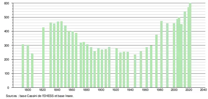 L'évolution du nombre d'habitants est connue à travers les recensements de la population effectués dans la commune depuis 1793. Pour les communes de moins de 10 000 habitants, une enquête de recensement portant sur toute la population est réalisée tous les cinq ans, les populations légales des années intermédiaires étant quant à elles estimées par interpolation ou extrapolation[39]. Pour la commune, le premier recensement exhaustif entrant dans le cadre du nouveau dispositif a été réalisé en 2004[40].