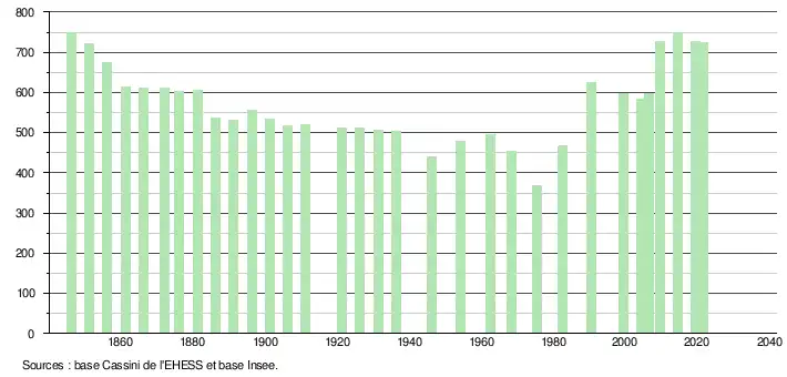 - Population municipale légale en vigueur au 1er janvier 2024, millésimée 2021, définie dans les limites territoriales en vigueur au 1er janvier 2023, date de référence statistique : 1er janvier 2021.
