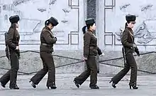 Le service militaire en Corée du Nord est le plus long du monde[2]. Le pays est officiellement toujours en guerre contre la Corée du Sud[3]. Les hommes en bonne santé y servent obligatoirement 10 ans, les femmes 6 ans. Mais pas les membres de la classe socio-économique « hostile » ainsi que les prisonniers politique qui en sont exclus. L'armée représente 5 % de la population, contre 1 % au Sud[2].