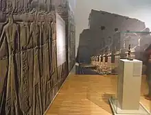 La première partie se compose de deux salles dont les murs verts évoquent le fleuve nourricier. La première, illustrée d'un agrandissement d'une vue générale de Karnak datant de 1851 et , permet d'exposer sur un plan historique et géographique la ville de Thèbes située sur la rive est du Nil, dont provient une bonne partie de la collection grenobloise. Les visiteurs découvrent en premier une couverture de momie en bois ainsi que le fonds de la cuve du cercueil intérieur de Hénouttaneb, maîtresse de maison durant la XXIe dynastie. C'est également l'occasion de rappeler le legs fait au musée par le fils du comte de Saint-Ferriol, dont l'un des carnets de voyage qu'il rédigea durant son périple égyptien de 1841 est exposé. On retrouve quelques éléments d'actualité de la fin du XIXe siècle retraçant la découverte de tombes sur le site de Deir el-Bahari avec le magazine L'Illustration du 4 avril 1891 et une photographie des fouilleurs sur la deuxième Cachette de Deir el-Bahari prêtée par le Collège de France[13]. Une série de fragments de blocs de grès représentant des scènes rituelles comme l'investiture d'un roi sont accrochés aux murs.