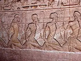 Les prisonniers de guerre pouvaient être emmenés en Égypte et donnés à des particuliers ou aux temples, pour le compte desquels ils étaient affectés à des travaux[35]. Les prisonniers de guerre pouvaient être marqués au fer rouge[36]. Ils recevaient des noms égyptiens, marque d'une égyptianisation et d'une assimilation[37].
