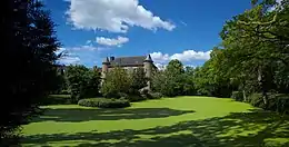 Le château du Gué[29]. La majeure partie du logis a été endommagée par un incendie qui lui à faire perdre sa belle toiture et un étage ainsi qu'un bâtiment accolé à l'est que l'on peut voir sur les gravures de l'époque. Le dôme de la chapelle et son campanile ont également disparu car le château avait été laissé à l'abandon. On peut toutefois voir l'allure du château à la fin du XIXe siècle sur un plan de Servon datant de la même époque affiché en mairie et une photo en noir et blanc datant du début du siècle. En face du château se trouvent les écuries datant du XVIIIe siècle. Une date sur une pierre d'entourage de porte est gravée 1784. Mis à part qu'il fut aux XVIIe et XVIIIe siècles propriété de la famille De Marbeuf très influente à Rennes, le château est également lieu de certaines légendes comme celle de cette madame Courteille qui y serait morte et hantait le curé du coin. Au château eut également lieu en 1677 le mariage des parents de celui qui fondera en 1709 à Paris la congrégation du Saint-Esprit : Claude Poullart.