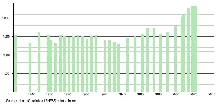 L'évolution du nombre d'habitants est connue à travers les recensements de la population effectués dans la commune depuis 1822. Pour les communes de moins de 10 000 habitants, une enquête de recensement portant sur toute la population est réalisée tous les cinq ans, les populations légales des années intermédiaires étant quant à elles estimées par interpolation ou extrapolation[16]. Pour la commune, le premier recensement exhaustif entrant dans le cadre du nouveau dispositif a été réalisé en 2008[17].