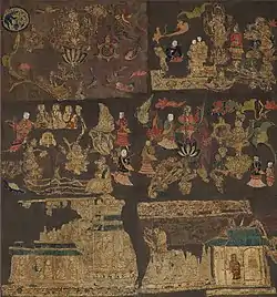 - Un jour qu'il méditait au Yumedono (La salle des rêves) son âme sortit de son corps[alpha 7] et vola par-dessus terre et mer jusqu'en Chine d'où elle ramena le Sutra du Lotus[réf. nécessaire]. Sur l'emplacement où ce phénomène est dit s'être produit, une statue de la bodhisattva féminine Kannon a été érigée[réf. souhaitée]