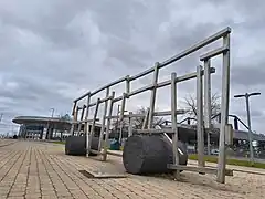 Il y a trois œuvres d'art public dans la station, deux sculptures à l'extérieur et une murale très grande à l'intérieur.
