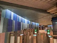 La murale, créé en 1994[4] par l'artiste Arlene Stamp et intitulée Sliding Pi (Pi glissant)[2], couvre quasiment tous les murs de l'intérieur de la station, sauf ceux du niveau de la rue et celui du niveau du quai en direction sud. Au niveau du hall on trouve une plaque explicative qui précise que l'œuvre représente le numéro π.