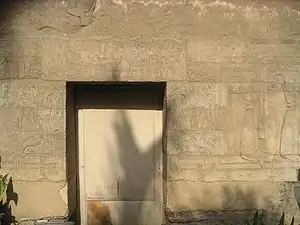 Les montants de la porte et le reste des reliefs du monument datent de Sheshonq et le représentent faisant des offrandes aux dieux des nécropoles, dont Osiris, suivi et épaulé par Isis et Nephtys, Sokar, Hathor et Anubis. Ce dernier est représenté par deux fois, encadrant de part et d'autre la porte dans la position classique du chacal couché sur un coffre, le flagellum nekhekh émergeant de son dos et le sceptre sekhem entre les pattes avant, en tant que gardien des tombes.