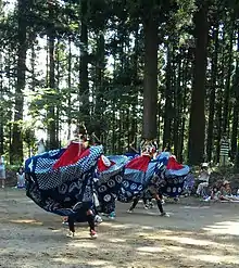 Sous une cape de couleur bleue, les danseurs dissimulent un tambour qu'ils frappent en rythme tout en dansant. Il y a plusieurs types de lion, dont : Le lion du milieu (中獅子), le lion porte-étendard (旗獅子), le héron blanc (白鷺), le lion mâle (牡獅子), et le lion femelle (牝獅子), celui-ci étant reconnaissable à ses deux fleurs rouges sur son masque — les mâles en ont des blanches. En dehors des lions, d'autres figurants participent à la danse : La guerrière au bambou (女装の簓) — il s'agit souvent d'un homme déguisé en femme —, le guerrier au sabre (太刀遣い), le guerrier au bâton (棒遣い), et les chanteurs. Au total, près de 30 personnes animent la shishi-odori[3].