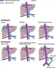 Il existe deux types de shunts porto-systémiques congénitaux: les shunts extra-hépatiques et les shunts intra-hépatiques. Le shunt extra-hépatique, comme son nom l'indique, se suite à l’extérieur du foie, ce shunt permet une communication anormale entre la veine porte (ou une de ses veines afférentes) et la veine cave, et leur classification est déterminée par la présence ou pas du flux portal vers le foie. Le shunt intra-hépatique se suite à l'intérieur du foie, il constitue une communication d'une branche de la veine porte et la veine sus-hépatique ou la veine cave inférieure ou alors se représente par la persistance du ductus venosus[11]. Chaque type de shunt peut être classé en sous-groupe en fonction de la divers paramètres anatomiques tels que la localisation, la configuration, le nombre et la taille des shunts impliqués[12]. Il se peut aussi que différents types de SPSC se combinent.