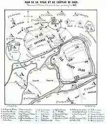 Le , Henri V arrive avec le gros de ses troupes au pied des remparts de la ville. Son frère l'installe dans le palais des ducs de Normandie au sein de l'abbaye saint-Étienne qui devient le quartier général de son armée[1]. Le roi répartit ses hommes autour de la ville en quinze détachements (cf. plan). Pour assurer les liaisons entre ses détachements, le roi a fait venir d'Angleterre un équipage de pont mobile qui permet le passage sur l'Odon et l'Orne[1]. La ville est entourée de canons anglais, eux-mêmes protégés par des levées de terre et des fossés pour éviter une sortie des Français. Les Anglais en font usage et détruisent bon nombre de murailles et habitations[1]. Les Français ne disposent pas de la même puissance de feu que les Anglais. Mais les canonniers français utilisent des boulets de fer rougis à la forge qui font des dégâts dans les logis anglais[1]. Ils utilisent aussi des balistes et des catapultes. Malgré leur infériorité numérique et leurs armes moins puissantes, les défenseurs de Caen tiennent le coup et chaque nuit réparent les dommages[N 3] causés par les Anglais dans les défenses de la ville[1].