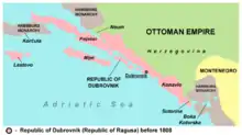 En 1806, la république de Raguse doit capituler face à l'armée impériale française[1] pour mettre fin au siège mené depuis plusieurs mois par la marine russe et au cours duquel 3 000 boulets ont été tirés sur la ville. L'arrivée des Français met fin aux opérations et ces derniers entrent peu après dans Raguse. En 1808, Napoléon envoie le général Marmont pour abolir la république de Raguse et fusionner son territoire avec celui du royaume d'Italie, un État-satellite sous influence française. Marmont devient duc de Raguse tandis que la ville ainsi que l'ensemble de la Dalmatie sont annexées dans les Provinces illyriennes lorsque celles-ci sont créées en 1810[2].