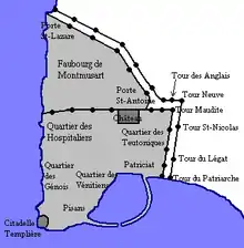 Guillaume de Beaujeu, grand maître du Temple, et Jean de Villiers, grand maître de l'ordre des Hospitaliers, longtemps rivaux et réconciliés à l'heure du danger, défendent le point le plus menacé, la porte Saint-Antoine. Atteint d'une flèche sous l'aisselle, Guillaume se retire du combat. Des croisés lui crient : « Pour Dieu, sire, ne partez pas, car la ville sera bientôt perdue ! », ce à quoi Guillaume répond « Seigneurs, je ne peux plus, car je suis mort, voyez le coup. » On l'emporte à la commanderie du Temple où il expire quelques heures plus tard. Jean de Villiers, également grièvement blessé, est transporté sur un navire en direction de Chypre. Les Mamelouks prennent alors la porte Saint-Antoine et se ruent dans la ville, massacrant les habitants. Certains tentent de fuir avec les navires dont quelques-uns, surchargés, coulent[13],[12].