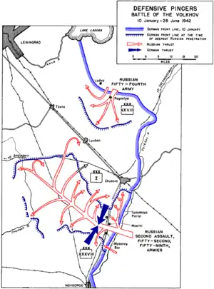 Le , malgré un ordre contraire de Hitler, le maréchal von Leeb ordonne l'abandon complet de la poche de Tikhvine et le retour sur la ligne de la Volkhov[22]. C'est le premier repli important du Groupe d'armées Nord.