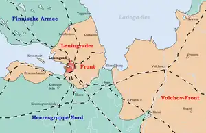 Le lac Ladoga sert de voie de ravitaillement[19], mais le , avec l'arrivée de l'hiver et de l'embâcle, les navires ne peuvent plus passer et les camions pas encore, la glace n'étant pas assez solide pour supporter leur poids. À partir du , le ravitaillement parvient aux Russes par convoi de traîneaux tirés par des chevaux jusque mi- à travers le lac gelé. On commence la construction d'une voie ferrée sur la glace en . Pendant l'hiver de 1942-1943, la « route de la vie » recommence à fonctionner, d'abord avec un trafic de chevaux, puis avec des véhicules à moteur à partir du . Les attaques allemandes se multiplient sur ce passage mais ne parviennent pas à couper ce lien[17].