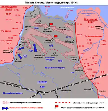 Une ultime réunion de préparation de l'offensive d'envergure principale Léningrad–Novgorod se tient à Smolny le [33]. Le début des opérations est fixé pour le 14 à partir du secteur d'Oranienbaum, l'attaque à partir des hauteurs de Poulkovo devant être lancée le 15 c'est l'opération Tonnerre de Janvier. Le même jour, , quatre armées soviétiques réparties entre le lac Ilmen et le lac Ladoga (soit un front de 18 km) attaquent les positions allemandes, c'est l'offensive de Novgorod-Louga (ru). La résistance est vive mais les forces allemandes cèdent et les généraux Kirill Meretskov, commandant du front de Volkhov, et Leonid Govorov, commandant du front de Léningrad, effectuent leur jonction le . Le siège de Léningrad peut prendre fin[34].