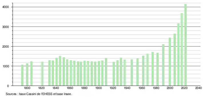 L'évolution du nombre d'habitants est connue à travers les recensements de la population effectués dans la commune depuis 1793. Pour les communes de moins de 10 000 habitants, une enquête de recensement portant sur toute la population est réalisée tous les cinq ans, les populations légales des années intermédiaires étant quant à elles estimées par interpolation ou extrapolation[18]. Pour la commune, le premier recensement exhaustif entrant dans le cadre du nouveau dispositif a été réalisé en 2006[19].