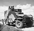 Une Jeep Willys, véhicule de liaison dans l' Armoured Division, timbrée de l'étoile blanche.