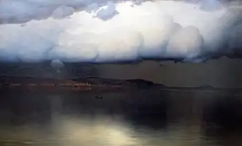 Le tableau représente des nuages d'orage éclairés par le soleil, en suspension au-dessus de la surface de l'eau. Leur partie supérieure fait penser à du coton blanc, tandis que leur partie inférieure est d'une couleur noire inquiétante. C'est le calme plat, il n'y a pas de vent et sur la surface lisse des eaux se reflètent les parties claires et foncées des nuages. Au loin on aperçoit une côte escarpée avec les maisons d'un village[8],[19]. À gauche de la toile, des couronnes d'arbres et de buissons d'un rouge-orange vif se détachent sur le fond sombre d'une forêt[20]. Plus près du rivage, une petite barque dont le rameur tente d'atteindre la terre ferme, avant le début du mauvais temps[8],[19].