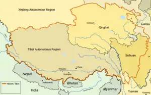 Le Tibet, qui échappait au contrôle de la Chine depuis 1912, fait l'objet en 1950 d'une intervention militaire de la république populaire de Chine ; les représentants à Pékin du 14e dalaï-lama doivent signer un accord en 17 points qui reconnaît le bien-fondé de la « libération pacifique » du Tibet et prévoit le maintien d'une autonomie régionale et du gouvernement tibétain. En 1959, le soulèvement tibétain, écrasé par l'armée chinoise, entraîne la fuite du dalaï-lama, la dissolution du gouvernement tibétain, et la formation six ans plus tard de la Région autonome du Tibet. Le bilan humain de la répression politique au Tibet ne fait l'objet d'aucun consensus : en 1984, l'Administration centrale tibétaine (gouvernement en exil du dalaï-lama) parle de 1,2 million de morts causés depuis 1951[8],[9]. Le journaliste et écrivain britannique Patrick French estime pour sa part que si le nombre de morts tibétains a été aussi élevé dans le Ganzou, le Sichuan er le Qinghaï que dans le Tibet central au début des années 1960, on peut avancer avec un certain degré de probabilité qu'environ 500 000 Tibétains seraient « directement morts à cause de la politique appliquée au Tibet par la république populaire de Chine »[10].
