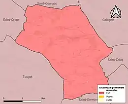 Le retrait-gonflement des sols argileux est susceptible d'engendrer des dommages importants aux bâtiments en cas d’alternance de périodes de sécheresse et de pluie. La totalité de la commune est en aléa moyen ou fort (94,5 % au niveau départemental et 48,5 % au niveau national). Sur les 84 bâtiments dénombrés sur la commune en 2019, 84 sont en aléa moyen ou fort, soit 100 %, à comparer aux 93 % au niveau départemental et 54 % au niveau national. Une cartographie de l'exposition du territoire national au retrait gonflement des sols argileux est disponible sur le site du BRGM[21],[Carte 3].