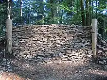 La fortification de barrage située à l’avant de la principale est matérialisée par des dalles de calcaires effondrées. Une datation radiocarbone, couvrant la fin de La Tène ancienne et le début de La Tène moyenne (entre 410 et 230 av. J.-C. environ), vient relancer le débat autour de la chronologie des enceintes.