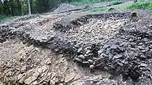 À l’intérieur de la fortification, la fouille a mis en évidence un amoncellement de plaquettes de calcaire issues du substrat, formant une véritable terrasse sur le point culminant de l’éperon. Il s’agirait plutôt d’une plateforme, facilitant l’implantation d’un habitat, que d’un ouvrage défensif. La présence de faune, de céramique et de mobilier lithique témoigne d’une occupation au début du Premier Âge du Fer.