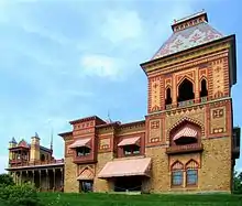 La villa en pierre, en briques et en polychrome à Olana est un mélange inhabituel d'éléments structurels victoriens et de motifs décoratifs du Moyen-Orient de différentes époques et endroits. Les éléments mauresques se mélangent aux thèmes Italiens contrastés[4]. Frederic et Isabel Church émussent par l'architecture qu'ils avaient vue lors de leurs voyages à Beyrouth, Jérusalem et Damas en 1868. À leur retour dans leur ferme, ils abandonnèrent les plans préliminaires de Richard Morris Hunt délimitant une maison de manoir dans le style français. Au lieu de cela, Church a travaillé en étroite collaboration avec l'architecte Calvert Vaux pour réaliser une vision plus personnelle. Church était responsable de la conception globale et des détails, avec la participation de Vaux essentiellement celle de consultant. Church écrivit à un ami: «Je construis une maison et je suis mon propre architecte. Je donne des directives toute la journée, dessine des plans et des dessins de travail toute la nuit. " [15] Le résultat était une villa avec une masse asymétrique de tours et de blocs en maçonnerie ponctuée de fenêtres et de porches fantaisistes. La silhouette irrégulière de l'extérieur contrastait avec le rythme plus régulier des pièces disposées autour d'une grande salle centrale. Sur l'extérieur, les motifs du Moyen-Orient ont été réalisés en brique colorée, en ardoise, en céramique et en particulier en pochoir. Les corniches des sections distinctes de la structure étaient chacune ornées de pochoirs multicolores et dorés, de motifs conçus par Church lui-même. Le pochoir s'est poursuivi dans les salles principales du premier étage. Ensemble, les différents motifs et thèmes créent une unité artistique unique, difficile à classer. Il a été appelé diversement persan-mauresque-éclectique et italianisant-oriental-pittoresque. Le poète John Ashbery a décrit les résultats : « L'ensemble est à couper le souffle, et malgré la prolifération des éléments architecturaux et de la décoration de la tuile polychrome, il n'est pas occupé, mais solennel et follement fantaisiste, comme la peinture de Church [16]