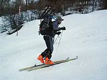 - le ski de randonnée, orienté vers l'activité de loisir, historique, contemplatif, sans objectif de performance ou de compétition[9]. Il consiste en une sortie à la journée ou de plusieurs jours (raids) avec un sac et un équipement adaptés. Les skis utilisés sont très proches dans leur conception des skis alpins dits « de piste » mais plus légers ; cette pratique n'exclut pas l'emploi de matériel d'alpinisme selon la difficulté ou les conditions. Il est désigné aussi sous l'appellation « ski de montagne », vulgarisée par Philippe Traynard[10] : « le ski de montagne est autonome, bien distinct des disciplines si voisines et si différentes de l'alpinisme et du ski de station[11]. Le ski de montagne est respectueux des paysages, par opposition au ski de piste qui les déforme et les artificialise »[12] ;