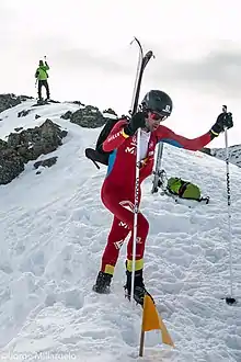 - le ski-alpinisme, c'est-à-dire le ski de randonnée moderne de compétition[13],[14] et dont se revendiquent les organisateurs de ces épreuves du genre[15],[16], véritables courses chronométrées sur parcours balisés, nécessitant parfois d'être encordé notamment sur glacier, et qui comportent elles-mêmes plusieurs disciplines (Vertical Race, relais masculin, féminin, sprint, etc.) et un matériel allégé[17]. Au plus haut niveau se tiennent les championnats de France, d'Europe, du monde et une coupe du monde de ski-alpinisme. Sport de démonstration aux Jeux olympiques de la jeunesse d'hiver de 2020, le ski-alpinisme est inscrit comme discipline olympique aux Jeux olympiques d'hiver de 2026[18]. Cependant, certaines institutions ou organisations considèrent que le ski de randonnée devient ski-alpinisme quand le matériel d'alpinisme est mis en œuvre (seules la difficulté et la performance technique prévalent, avec ou sans chronométrage)[19],[20], ce qui participe de la confusion dans la dénomination de ces disciplines.