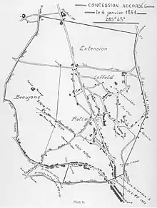 La Société des Charbonnages de Patience et Beaujonc a été constituée par acte notarié le , sur base des sociétés plus anciennes Beaujonc (Glain, à l'ouest), Conquête et Patience (Ans bas, au sud-est) et enfin Loffeld (Ans haut, une quinzaine d'hectares, au nord-est). La concession fut reconnue 2 ans plus tard, et comprenait une nouvelle extension à l'ouest de Visé-Voie (les actuelles rue Jean Jaurès et rue des Français) qui fut essentiellement exploitée par le puits Fanny ouvert en 1894[3]. La concession totalisait 285 ha et 45 a.