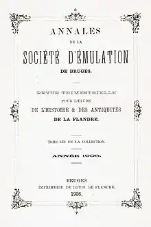 - Charles van Renynghe de Voxvrie, « Les revues historiques des Flandres ». I. La Société d'Emulation pour l'histoire et les antiquités de la Flandre Occidentale, dans : Tablettes des Flandres, T. I, Bruges, 1948, pp. 199-219.