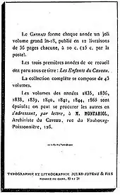 - Annonce parue dans Le Caveau., Paris 1877, page 506.