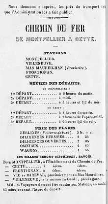La gare de Montpellier, située au faubourg de la Saunerie[39], est composée de deux bâtiments distincts ; à droite celui destiné au public avec deux salles d’attente (une pour les voyageurs en berlines et diligences, l’autre pour ceux des omnibus ou wagons), le bureau des recettes et des bagages ; à gauche, celui de l’administration et du logement du directeur. En sortant du bâtiment voyageur, et au son d’une cloche donnant le signal du départ[40], on traverse une cour pour rejoindre, à droite, un « hangar », de 50 m de long sur 10 m de large et surmonté d’une horloge, pour accéder aux voitures (20 au maximum) rangées sur deux voies. À gauche de la cour, se situe le « hangar » réservé au mouvement commercial. Immédiatement après le hangar voyageur et sur le même côté, se trouvent les ateliers de réparation. À gauche en vis-à-vis la remise des locomotives.