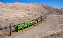 Un train tracté par deux locomotives électriques modernes près de Barriles.