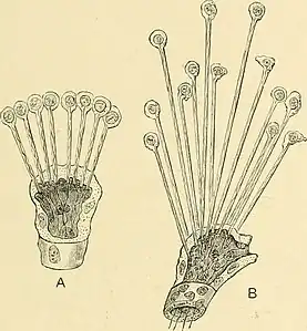 Le corps basal, composé de neuf triplets de microtubules, sert à ancrer les flagelles dans la cellule (agissant comme un centriole modifié). Au centre de chaque flagelle se trouve l'axonème, qui contient neuf doublets de microtubules encerclant une paire de microtubules simples, générant un motif 9+2[10],[11]. Des milliers de dynéines sont attachés aux doublets des axonèmes, permettant la motilité flagellaire[11]. Plus précisément, les dynéines s'ancrent sur un doublet à l'intérieur de l'anneau microtubulaire externe, et lorsqu'elles « marchent » vers un doublet adjacent, la structure flagellaire entière est capable de se plier et de battre[12]. Le mouvement du flagelle permet aux solénocytes de transporter les matériaux excréteurs et le liquide cœlomique dans la lumière du tubule intracellulaire[8].