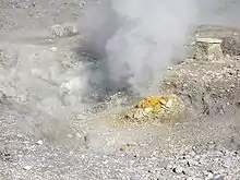 Le paysage est lunaire, constitué de cendres et de nombreuses fentes dans le sol d'où s'échappent des fumerolles. La principale, dite Bocca Grande (« grande bouche » en italien, « grande fumerolle » en français), émet des gaz de l'ordre de 1 500 tonnes de dioxyde de carbone et 3 300 tonnes de vapeur riche en minéraux (bore, sodium, magnésium, vanadium, arsenic, zinc, iode, antimoine, rubidium…) par jour à une température d'environ 160-200 °C[2]. Ce dégazage dépose sur les roches adjacentes des cristaux rouges de réalgar et cinabre et des cristaux jaunes d’orpiment. Il a été démontré que la composition chimique de ces gaz (anhydride carbonique, anhydride sulfureux, etc.) et la température varient au cours du temps.