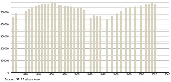 - Population municipale légale en vigueur au 1er janvier 2024, millésimée 2021, définie dans les limites territoriales en vigueur au 1er janvier 2023, date de référence statistique : 1er janvier 2021.