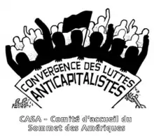 Trois coalitions jouent, pour leur part, un rôle important dans l'organisation du contre-sommet des Amériques lors du 20 et 21 avril 2001. Le Sommet des peuples des Amériques est inauguré par le premier ministre canadien, avec une forte représentation syndicale internationale dont la Via Campesina et la CONAIE d'Équateur, liées à l'Alliance Sociale Continentale qui unit les délégués de tous les coins des Amériques[7]. Ensuite, sous les sigles de OQP 2001 (Opération Québec Printemps 2001) et GOMM (Groupe opposé à la mondialisation des marchés), une deuxième coalition fédère des réseaux des jeunes militants d'ATTAC et d'autres associations partisanes du « Non à la ZLÉA »[7]. Le GOMM arassemble plus de 15 000 personnes pour occuper le centre-ville de Québec, le vendredi 20 avril 2001[7]. Le troisième regroupement qui comprend les anarchistes du CLAC (Convergence de luttes anticapitalistes) et du CASA (Comité d'accueil du Sommet des Amériques), organise un carnaval contre le capitalisme et prend part à la rencontre de l'Action Mondiale des Peuples[7]. D'autre part, la jeunesse du Bas-St-Laurent présente lors des manifestations, prône la non-violence, réaffirme la nécessité d'une union de tous les exclus et réclame la reconnaissance des droits à la construction des alternatives[7]. Ceux-ci affirment qu'ils ont organisé des conférences, des kiosques d'informations et des formations de désobéissance civile[7]. Ils auraient sacrifié une partie de leurs études et loisirs, car ils croient en l'idéal qu'ils défendent, comme des milliers d'autres groupes comme eux. Ce mouvement de protestation est très fragmenté, composé de différents réseaux d'organisations et d'associations qui interviennent par secteurs d'activités, par quartiers ou groupes sociaux spécifiques[8].