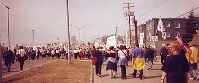 ![]() Marche dans la « zone verte » sur l'autoroute Laurentienne, en direction d'un rassemblement civil près du Colisée de Québec |