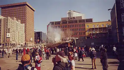 ![]() Manifestation à l'intersection du boulevard Honoré-Mercier et de la rue Saint-Jean le 21 avril 2001. La fumée provenant des gaz lacrymogènes et la barrière de sécurité peuvent être aperçus sur cette image. |
