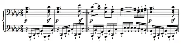 répété une fois, commence un ritardando dès la troisième mesure jusqu'à un point d'orgue à la cinquième mesure. Le thème continue par une phrase conclusive a tempo aboutissant à l'accord de mi