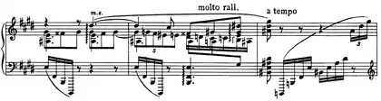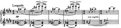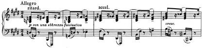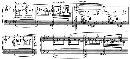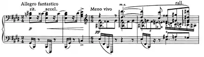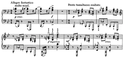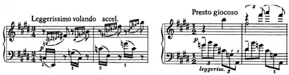 | 3 | ![]() Mm. 227-230. Le passage dérive du thème presto tumultuoso esaltato. ![]() Mm. 247-248 and 251-252. Le thème formé de trilles et le thème languido sont parodiés. |