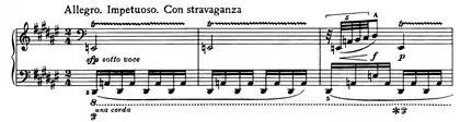 1-12 | La sonate commence avec une introduction. La première partie consiste en un thème agité, marqué allegro-impetuoso-con stravaganza. It features trills and glissandos, and ends in an agitated ascending rush followed by a pause. |