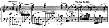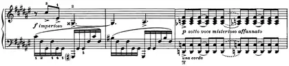 | Transition | ![]() Mes. 96-99. Motifs Imperioso et sotto voce misterioso affanato. ![]() Mes. 114-117. Motif Quasi tromba, écrit en mi bémol majeur. |